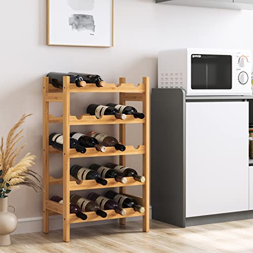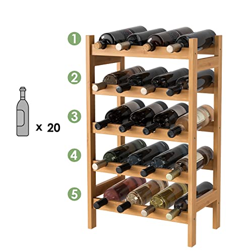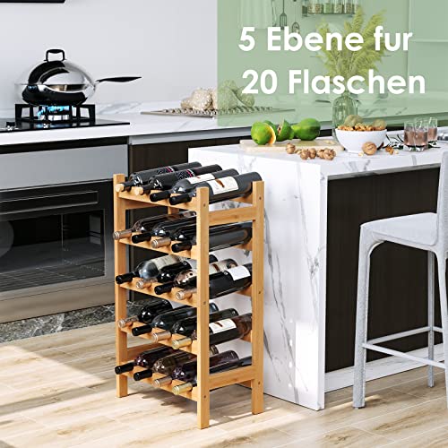 HOCSOK Wijnrek met 5 niveaus, flessenrek met 20 flessen, bamboe wijnkast voor keuken en bar, 43,5 x 24,6 x 73 cm