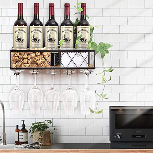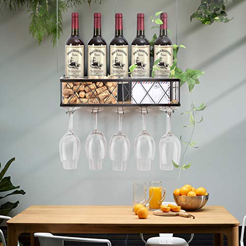 Specification: KINGRACK Wandgemonteerde wijnrek, metalen en houten wijnplank met glazen houder en kurkopslag, champagnefleshouder…